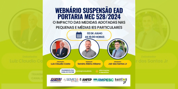 A SANTOS JR Consultoria, sempre preocupada em orientar as Instituições de Educação Superior Particulares, organiza para dia *02/07/24, às 16h, Webnário gratuito para debate sobre a Portaria MEC N° 528 de 06/06/24. Esta portaria interrompe novas ofertas de EAD no Brasil, suspende a criação de polos, sobresta processos regulatórios e promete a criação de novo […]